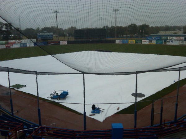 74069267.jpgThis is what it looked like here at Dunedin Stadium at about 8:45 am. For a little while, from about 11:30 to 12:30, the pounding rain subsided and it actually felt like there might be some baseball played here today.